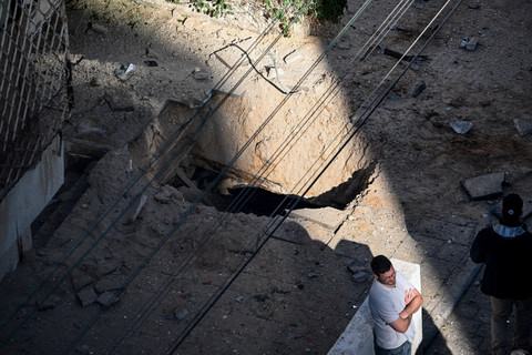 Salah satu rangkaian serangan itu menghantam lingkungan penduduk dan menciptakan kawah. Tampak kendaraan terlihat rusak imbas serangan.