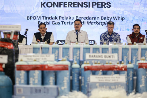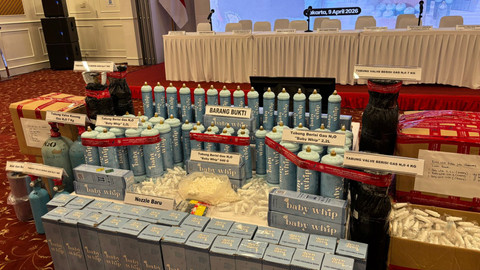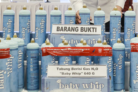 Kepala Badan Pengawas Obat dan Makanan (BPOM) Taruna Ikrar menyampaikan keterangan pada konferensi pers penindakan produk gas medis dinitrogen monoksida (N2O)/gas tertawa di Kantor BPOM, Jakarta, Kamis (9/4/2026). Foto: Dhemas Reviyanto/ANTARA FOTOTampak dalam konferensi tersebut Kepala BPOM Taruna Ikrar didampingi oleh Deputi Bidang Penindakan BPOM Tubagus Ade Hidayat, Deputi Bidang Pengawasan Obat, Narkotika, Psikotropika, Prekursor, dan Zat Adiktif BPOM William Adi Teja, dan Perwakilan Direktorat Tindak Pidana Narkoba Bareskrim Polri Kombes Pol Kelana Jaya. Foto: Dhemas Reviyanto/ANTARA FOTOBPOM bersama Polri menindak pengedaran ilegal gas dinitrogen monoksida (N2O) bermerek Baby Whip di kawasan Jakarta Barat. Foto: Dhemas Reviyanto/ANTARA FOTOAdapun barang bukti yang dihadirkan antara lain N2O Baby Whip 2,2 liter sebanyak 51 buah, tabung kosong gas NO2 Baby Whip 2,2 liter sebanyak lima buah dan nozzle sebanyak tiga dus sebagai alat bantu penggunaan Baby Whip. Foto: Ryan Iqbal/kumparan